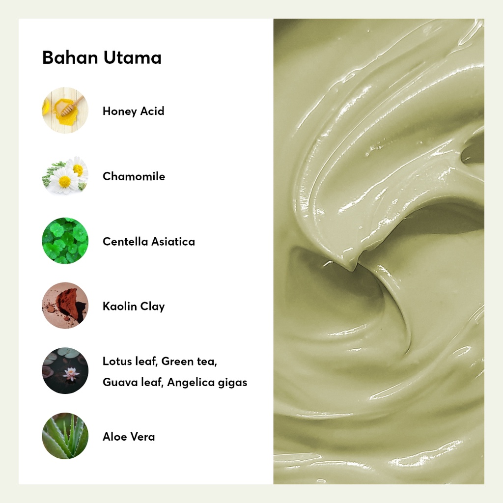 ▪️ Main Ingredients: Honey Acid Chamomile Centella Asiatica Kaolin Clay Lotus leaf, Green tea, Guava leaf, dan Angelica gigas Aloe Vera