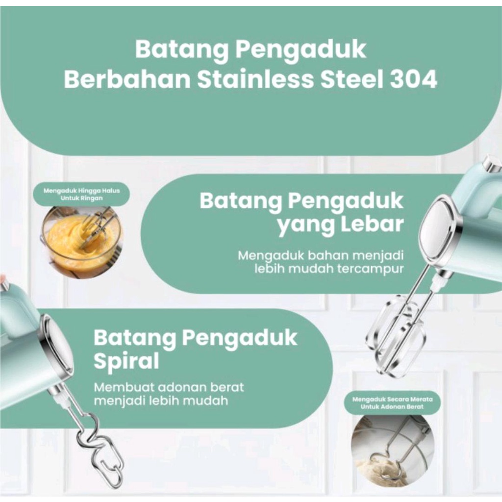 ⭐ Benefit produk : Mesin kuat dengan daya 300W: Perputaran yang cepat dan merata Batang pengaduk terbuat dari material stainless steel 304: Kuat dan tahan lama Tombol dan panel digital: Memudahkan untuk mengatur kecepatan pengaduk Memiliki 9 pilihan tingkat kecepatan Terdapat 2 pilihan mode penggunaan: Dapat digenggam atau menggunakan stand body (hands-free) Tingkat kebisingan yang rendah sehingga tidak berisik Mesin tidak mudah panas ketika digunakan dalam waktu yang lama Terdapat silicone anti-slip dibagian bawah agar tidak mudah bergeser Terdapat 2 buah gagang: Untuk pengaduk dan adonan