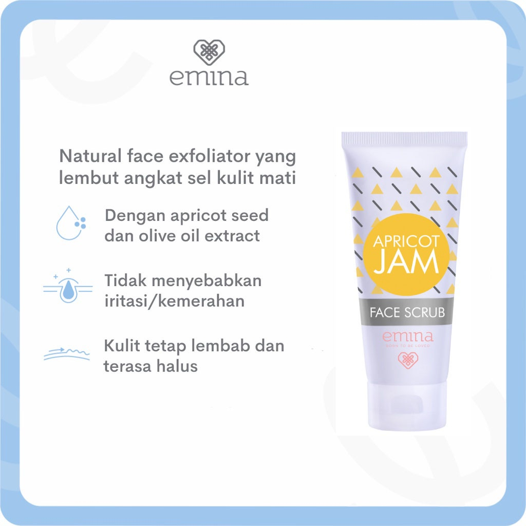 Emina Face Scrub Apricot Jam Face Scrub merupakan face scrub yang diformulasikan khusus dari biji apricot dan olive oil. Face scrub ini dapat mengangkat sel kulit mati dan sisa kosmetik yang tertinggal setelah bermakeup. Tesksturnya yang lembut (soft-scrub) mampu memberikan kenyamanan dan tidak membuat kulit menjadi iritasi. Dengan menggunakannya, kulit Anda akan lebih bersih, kenyal dan halus.