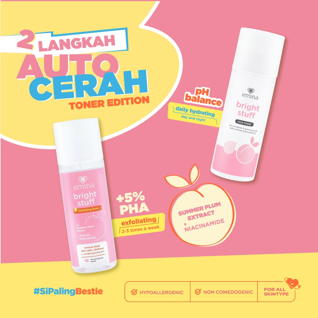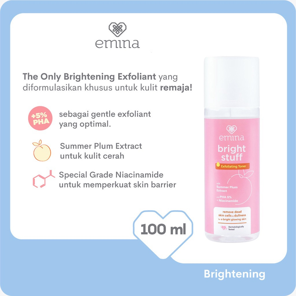 Emina Bright Stuff Exfoliating Toner adalah satu-satunya brightening exfoliant di Indonesia yang formulasinya didesain agar effective but gentle cerahkan kulit dan noda bekas jerawat pada teens Indonesia secara signifikan.