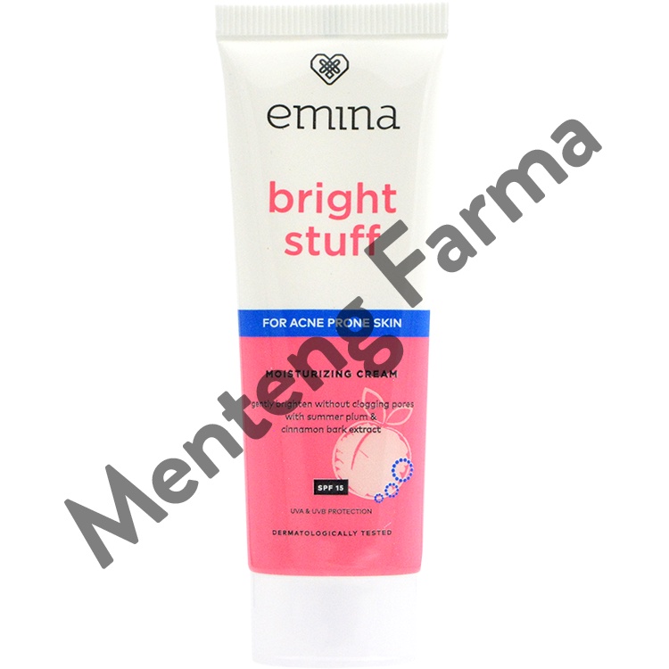 Manfaat Emina Bright Stuff for Acne Prone Skin Moisturizing Cream: - Melembabkan dan mencerahkan kulit wajah tanpa menyumbat pori-pori - Mengangkat kotoran dan sel kulit mati - Mengontrol minyak, mengurangi kemerahan dan iritasi pada wajah - Melindungi dari sinar UV dengan SPF 15