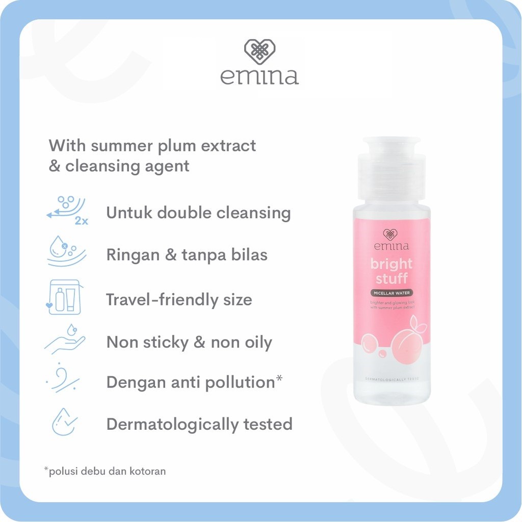 Emina Bright Stuff Micellar Water adalah pembersih wajah yang dapat mengangkat makeup dan kotoran pada wajah. Kandungan ekstrak summer plumnya berfungsi untuk mencerahkan dan melindungi kulitmu dari polusi.