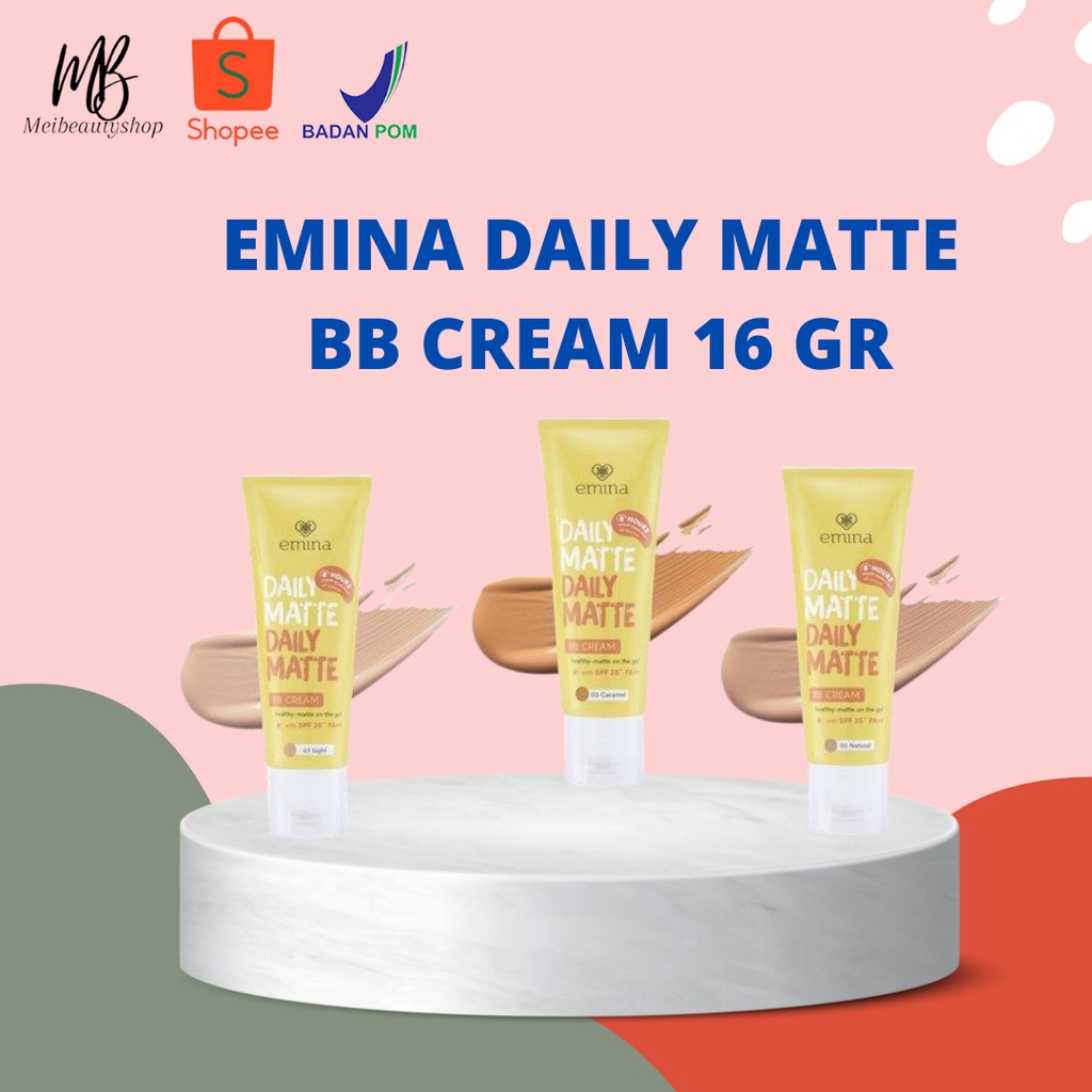 Emina Daily Matte BB Cream merupakan BB Cream dengan healthy-matte dan smooth finish yang dapat bertahan lama hingga 8 jam. Dilengkapi dengan Vitamin E, Trehalose dan UV Protection, BB Cream ini dapat membuat kulit terasa lembap sepanjang hari. BB Cream ini memiliki formula yang ringan dengan medium-buildable coverage dan cocok digunakan untuk normal & normal-to-oily skin karena mengandung Oil Control Agent. Diformulasikan khusus untuk para remaja, BB Cream ini tidak menimbulkan komedo (Non Comedogenic) dan tidak menimbulkan jerawat (Non Acnegenic)