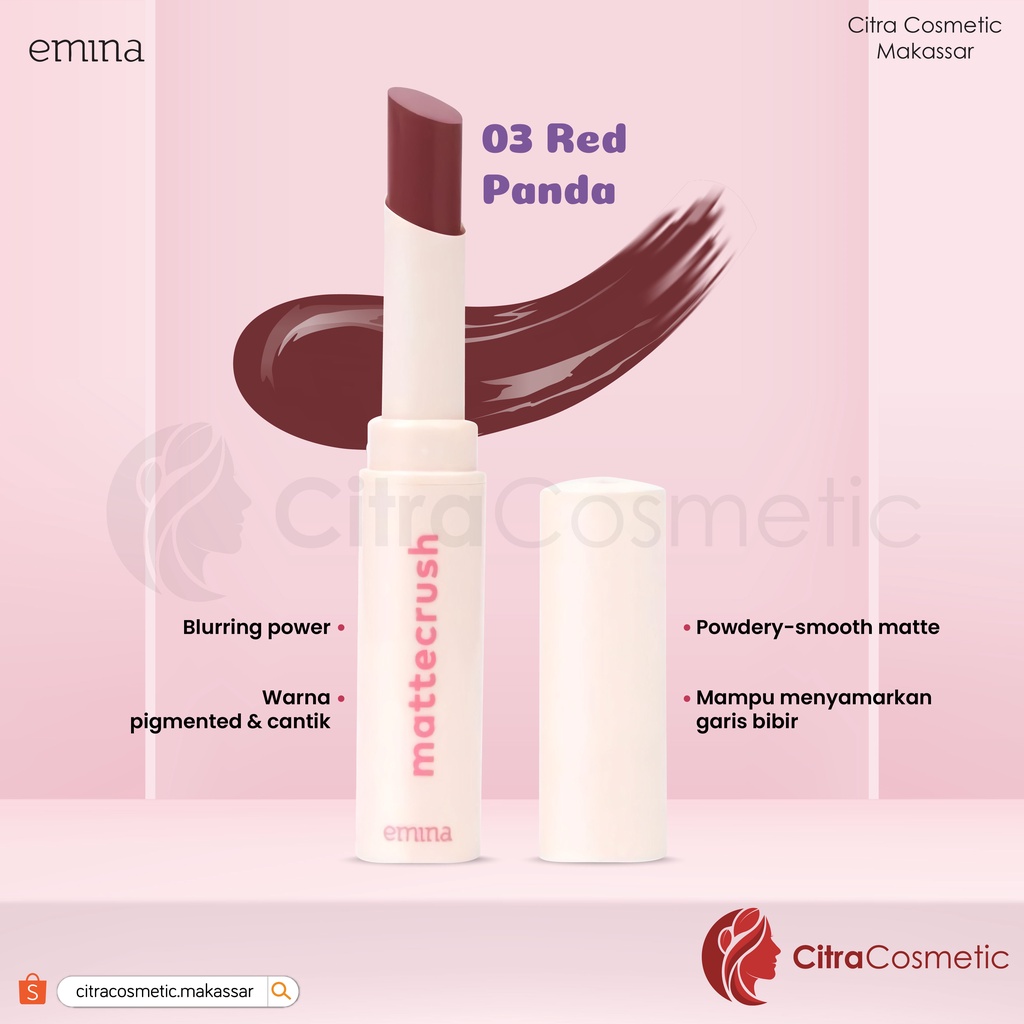 Emina Mattecrush adalah lipstik edisi terbatas yang saya sukai! Dengan blurring-power, Emina Mattecrush mampu menyamarkan garis bibir, membuat bibir terlihat lebih halus dengan finish matte, serta tetap kekinian dengan 6 warna yang up-to-date! Keunggulan: - Blurring power – mampu menyamarkan garis-garis halus di bibir sehingga membuat bibir terlihat halus - Powdery-smooth matte – membuat bibir terasa lembab, tidak lengket, terasa ringan dan nyaman dipakai seharian - 6 warna on-trend - Memiliki 6 varian warna yang kekinian dan up-to-date