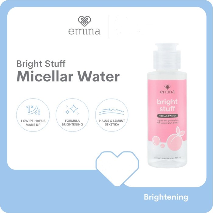 Emina Micellar Water Drop Cleanser – Bright Stuff 100 ml a. Mengandung Ekstrak summer pulm yang dapat membuat wajah tampak lebih cerah b. Mengandung Cleansing Agent yang membuat mengangkat dan membersihkan make up dalam satu kali usap c. Mengandung cucumber extract sebagai soothing agent yang menyegarkan