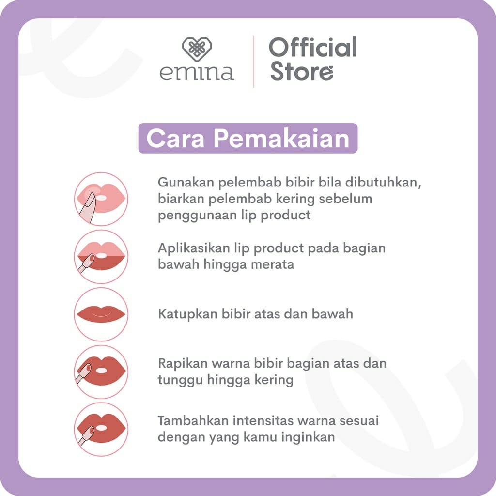 Cara Pemakaian : 1. Aplikasikan Emina Poppin' Matte Lip Cream pada bibir dengan menggunakan aplikator secara merata 2. Tunggu hingga lip cream set untuk mendapatkan hasil yang tahan lama