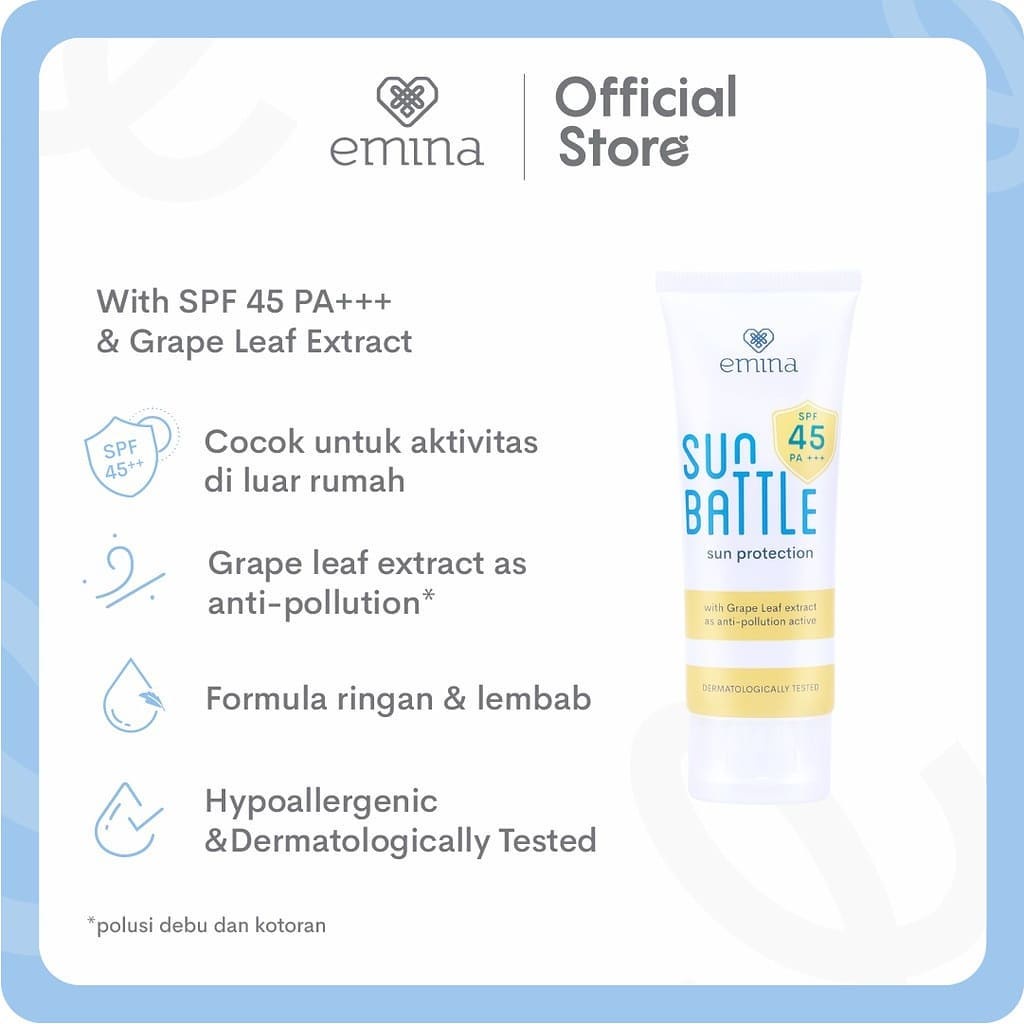 Emina sun protection Melindungi kulit dari efek buruk sinar UVA & UVB 1. Mengandung SPF 30 dan PA +++ untuk perlindungan maksimal 2. Ringan, mudah meresap dan tidak lengket di kulit 3. Mengandung aloe vera dan panthenol untuk melembabkan kulit wajah 4. Cocok untuk semua jenis kulit 5. Harga lebih terjangkau dibandingkan produk sejenis