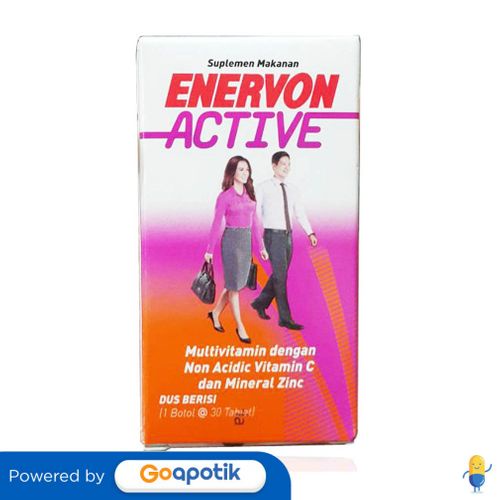 Deskripsi : Enervon active adalah suplemen untuk memenuhi kebutuhan vitamin tubuh | Komposisi : NON acidic vitamin C, vitamin B kompleks, zinc | Dosis : Diminum 1 tablet 1 kali sehari | Indikasi : Memenuhi kebutuhan vitamin C,vitamin B kompleks dan mineral Zinc | Perhatian Khusus : Tidak boleh digunakan untuk anak-anak | Kemasan : Botol, 30 Tablet | NIE : SD161548681