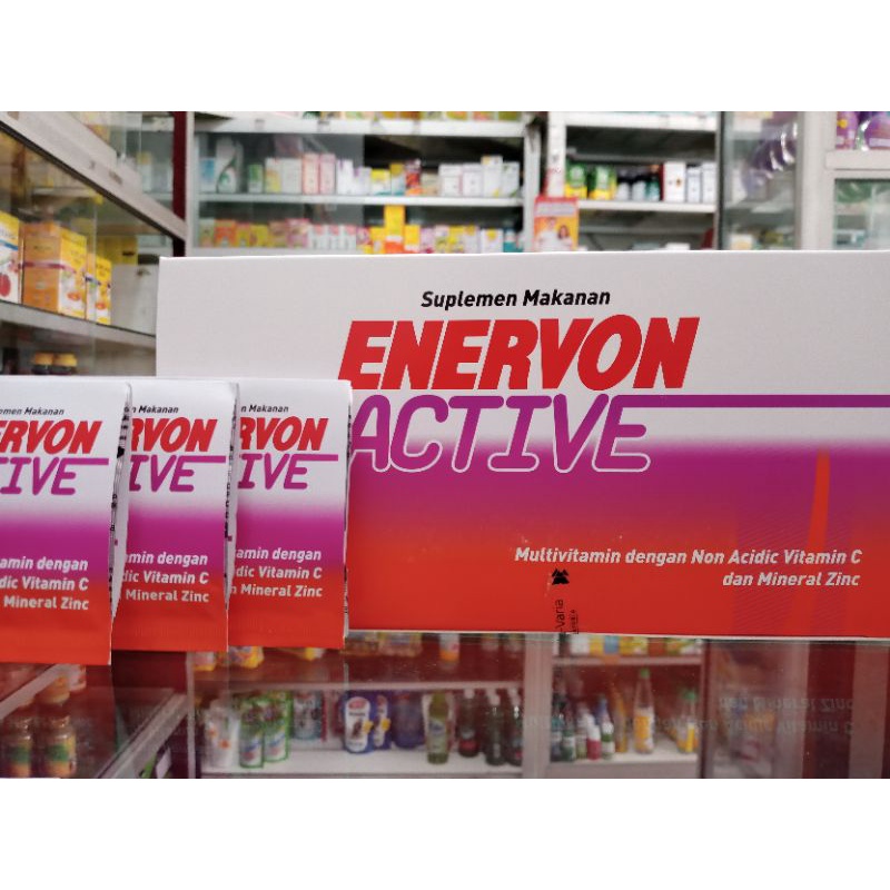 ENERVON ACTIVE merupakan suplemen dengan kandungan kombinasi antara Non Acidic Vitamin C dan B kompleks yang berfungsi untuk membantu memelihara daya tahan tubuh serta membantu memulihkan kndisi setelah sakit.Vitamin B kompleks yang terkandung diantaranya yaitu: Vitamin B,1 Vitamin B2, Vitamin B6, Vitamin B12 yang berfungsi untuk membantu dalam proses metabolisme tubuh dalam menghasilkan energi. Selain itu, suplemen ini juga mengandung Zinc yang digunakan untuk membantu memenuhi kebutuhan Zinc dalam tubuh.