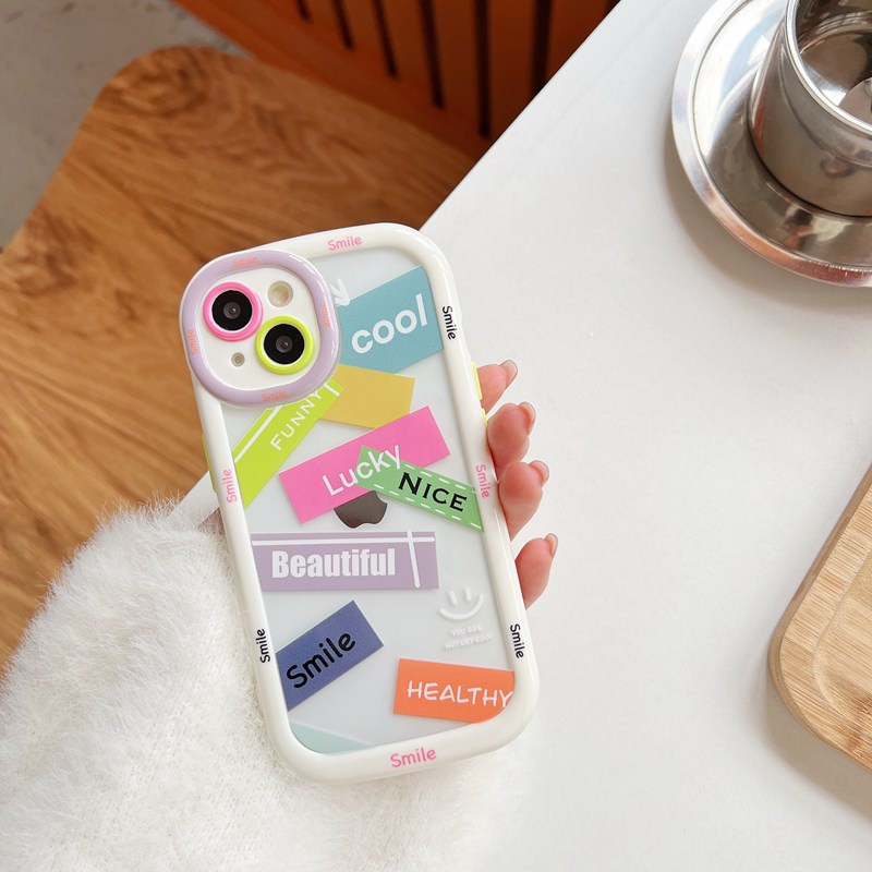 🔔【Ready Stock】 English Label Puff Case iPhone 11 12 13 14 Pro Max 14 Plus Women's Cute Pink White Good Luck Friends Gifts Soft Casing Cover