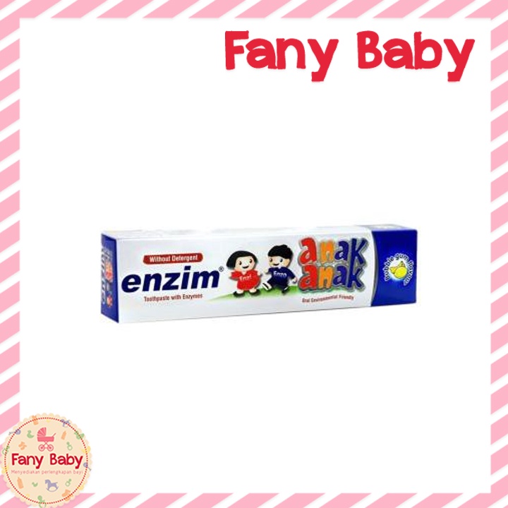 Jaga gigi anak Anda sedini mungkin dan ajari mereka untuk selalu menggosok gigi di siang dan malam hari menggunakan Enzim Pasta Gigi Anak yang merupakan pasta gigi anak yang diformulasi khusus untuk memberi perlindungan kesehatan mulut dan membantu mencegah kerusakan gigi anak. Mengandung enzim Amiloglucosidase (AMG), Gluco-oksidase (GO) dan Laktoperoksidase (LPO) yang berperan mengembalikan fungsi alamiah sistem laktoperoksidase di dalam air ludah sehingga perkembangbiakan bakteri dalam rongga mulut dapat terkontrol. Juga mengandung Xylitol yang meningkatkan kontrol terhadap bakteri streptococcus mutans yang menyebabkan terjadinya gigi berlubang. Selain itu, pasta gigi enzim anak ini tidak mengandung deterjen sehingga tidak menyebabkan mulut kering, tidak mengiritasi dan tidak merusak indera pengecap (tidak merubah rasa makanan), serta terbuat dari bahan-bahan foodgrade sehingga aman apabila tertelan. Hadir dengan rasa Strawberry, Orange, Tutty Frutty, bubble Gum yang segar dan disukai anak, membuat anak senang dan rajin menggosok gigi. Kemasan tube yang praktis juga memudahkan saat penggunaan.