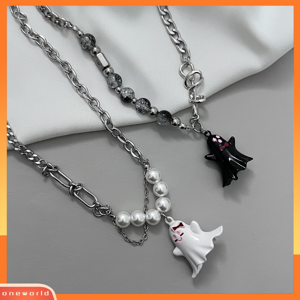 [EONE] Wanita Kalung Asimetris Mutiara Imitasi Palsu Kristal Hip Hop Hadiah Putih Hitam Hantu Liontin Musim Gugur Dingin Sweater Kalung Fashion Perhiasan