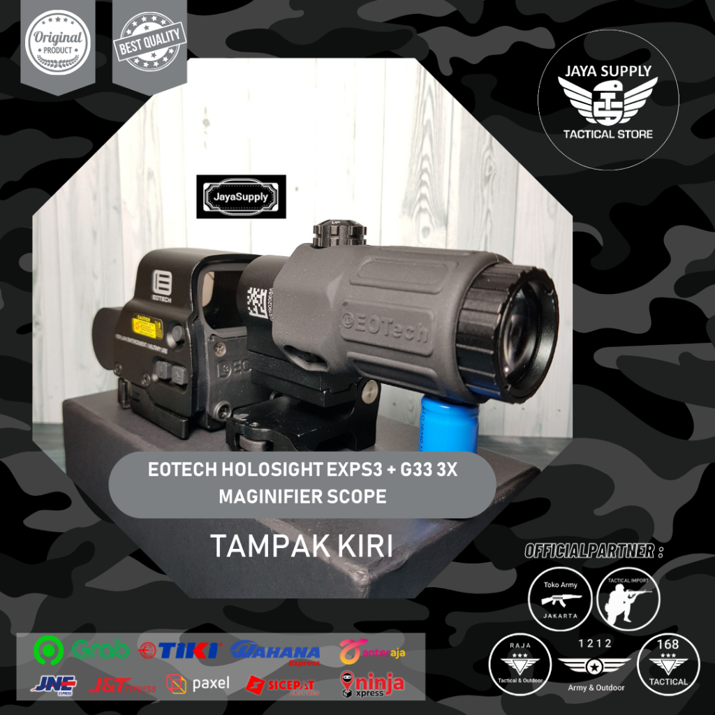 Isi box : - EOTECH EXPS3 + G33 - Baterai (ada dalam box) - Kain Pembersih - Kunci L besar (untuk pasang/lepas mounting) - Kunci L kecil (untuk adjust/kalibrasi)