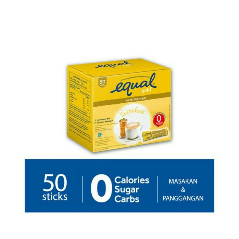 equal Gold Sweetener 50 s Merupakan pemanis pengganti gula. Rasa manis untuk 1 stick sama dengan 2 sendok teh gula biasa. Sweetener ini cocok sebagai pemanis kopi dan teh juga bisa untuk memasak. equal gold sweetener dapat menjadi cara terbaik Anda dalam menikmati rasa manis seperti gula tanpa kalori.