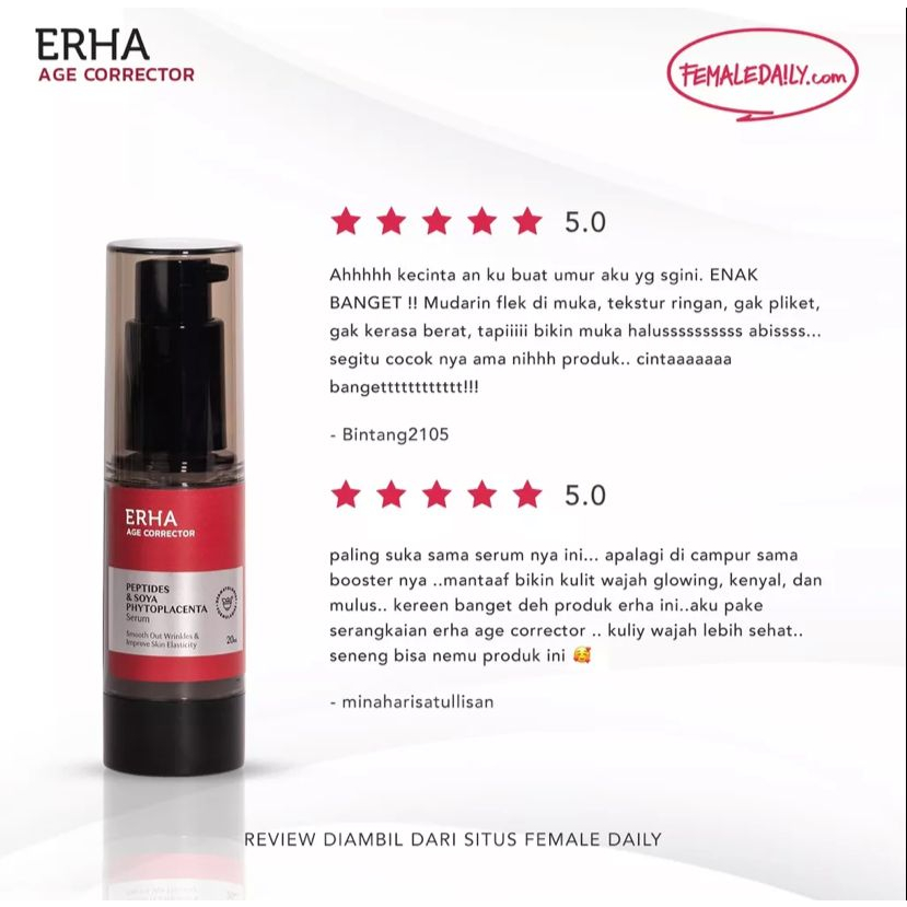 Dengan formula dermatologi, Erha Age Corrector Serum adalah serum wajah anti aging dengan kandungan Natural Retinoid yang Berfungsi membantu menyamarkan kerutan di wajah dan menjaga elastisitas kulit. Kandungan Snail Mucin Extract didalamnya bekerja dalam menjaga dan mengembalikan kelembapan kulit, serta menjaga tekstur kulit.