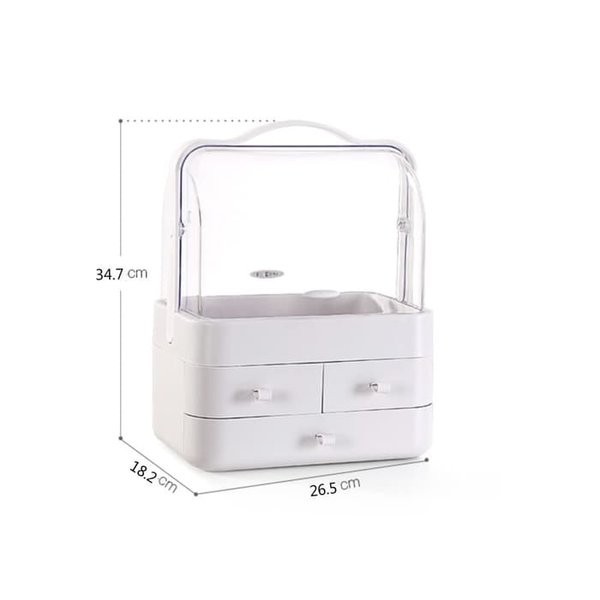 Rak kosmetik dari bahan Plastik PP yang ringan. kuat dan awet. Ada lacinya, juga ada sekat2 dan lemari untuk menyimpan berbagai macam keperluan kosmetik anda. Rak kosmetik berbahan transparan sehingga mempermudah mengambil produk makeup atau skincare kamu. Pada bagian atas juga terdapat cover untuk menutupi storage kamu dari debu-debu dan cipratan air. Dapat ditempatkan di meja rias, kamar mandi, ruang tidur dll