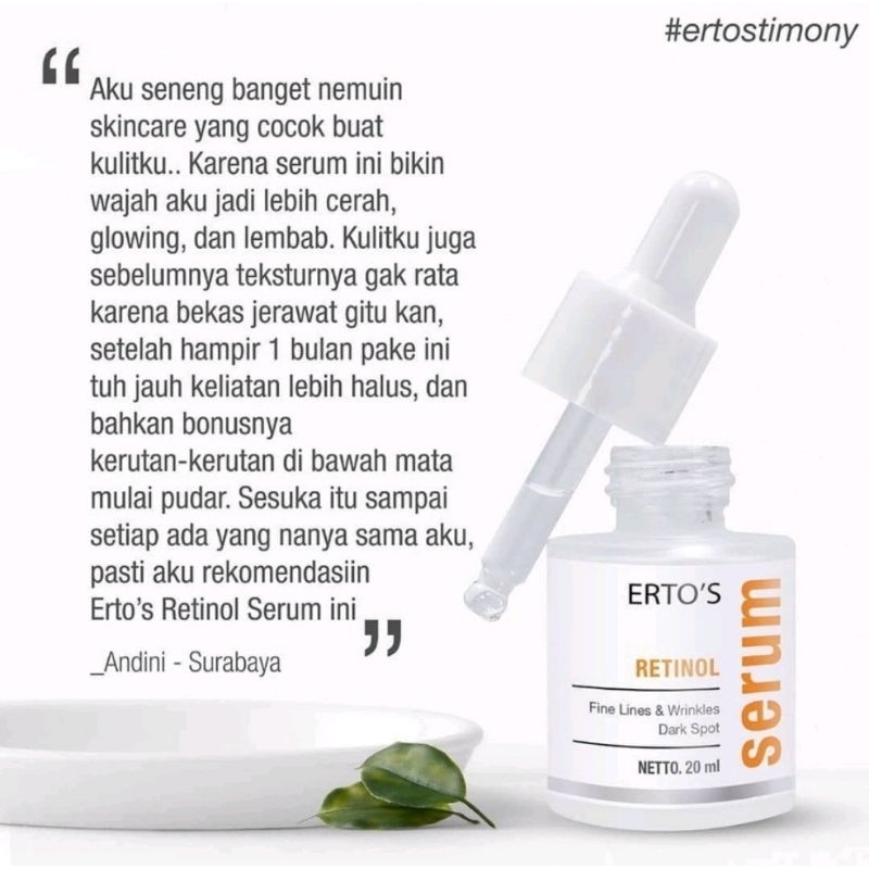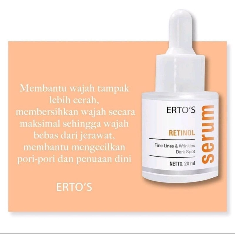 Merupakan serum yang mengandung Retinol yang berfungsi untuk mencerahkan kulit, meratakan tone warna kulit, menyamarkan bercak hitam. ERTO'S Retinol Serum baik digunakan untuk kulit dengan kerutan dan garis halus karena Retinol mampu menyamarkan tanda-tanda penuaan dini. ERTO'S Retinol serum juga diperkaya dengan Lipochroman-6 dan Soybean oil sebagai anti aging dan anti-oksidan untuk kulit.
