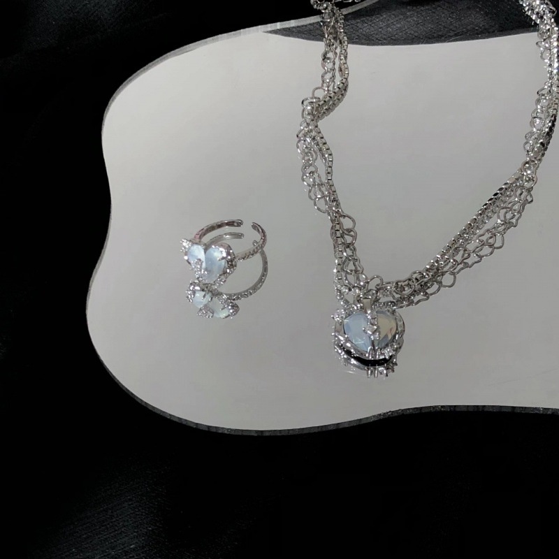 Detail Es Biru Putih Susu Zirkon Split Cinta Cincin Hati Sederhana Baroque Micro-Hias Zirkon Kristal Klavikula Rantai