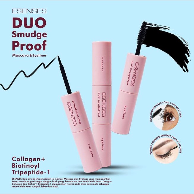 Esenses Duo SmudgeProof adalah kombinasi mascara dan eyeliner yang memudahkan kamu membuat garis tergas dengan hasil yang bervolume dan lentik lebih lama. Dengan Collagen dan Biotinoyl Tripeptide-1 memberikan nutrisi pada akar bulu mata sehingga terasa lebih kuat , tampak lebat dan tebal.