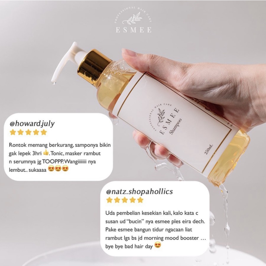 Shampoo ESMEE membersihkan kulit kepala yg berminyak sehingga rambut bersih dan bouncy serta menutrisi scalp supaya rambut tidak rontok, subur dan cepat panjang