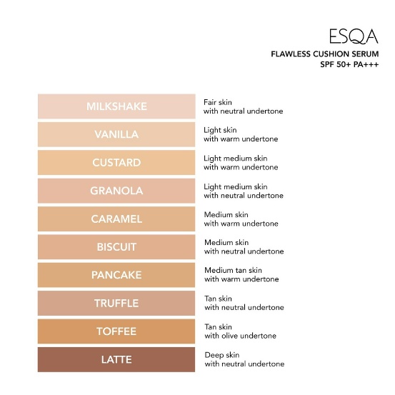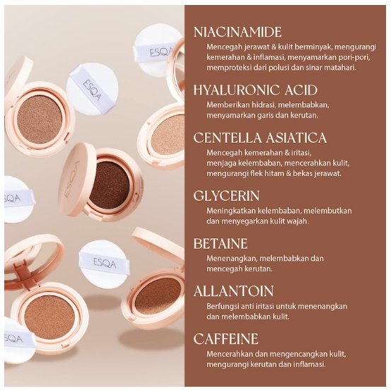 ESQA Flawless Cushion Serum SPF 50+ PA+++ merupakan cushion 3-in-1 yang dilengkapi dengan bahan-bahan skincare premium, foundation dengan full coverage, dan perlindungan dari sinar matahari yang tinggi. Dengan formula yang ringan, dapat menyempurnakan kulit yang tidak rata, mengurangi kemerahan, menghidrasi secara mendalam, menenangkan, dan mencerahkan kulit untuk hasil sempurna alami. Kulit akan tampak lebih bercahaya secara effortless. Powerful broad-spectrum SPF 50+ PA+++ dapat melindungi kulit dari paparan sinar UVA dan UVB setiap hari. Cushion ini juga non-comedogenic dan telah teruji klinis.