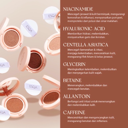 ESQA Flawless Cushion Serum SPF 50+ PA+++ merupakan cushion 3-in-1 yang dilengkapi dengan bahan-bahan skincare premium, foundation dengan full coverage, dan perlindungan dari sinar matahari yang tinggi. Dengan formula yang ringan, dapat menyempurnakan kulit yang tidak rata, mengurangi kemerahan, menghidrasi secara mendalam, menenangkan, dan mencerahkan kulit untuk hasil sempurna alami. Kulit akan tampak lebih bercahaya secara effortless. Powerful broad-spectrum SPF 50+ PA+++ dapat melindungi kulit dari paparan sinar UVA dan UVB setiap hari. Cushion ini juga non-comedogenic dan telah teruji klinis.