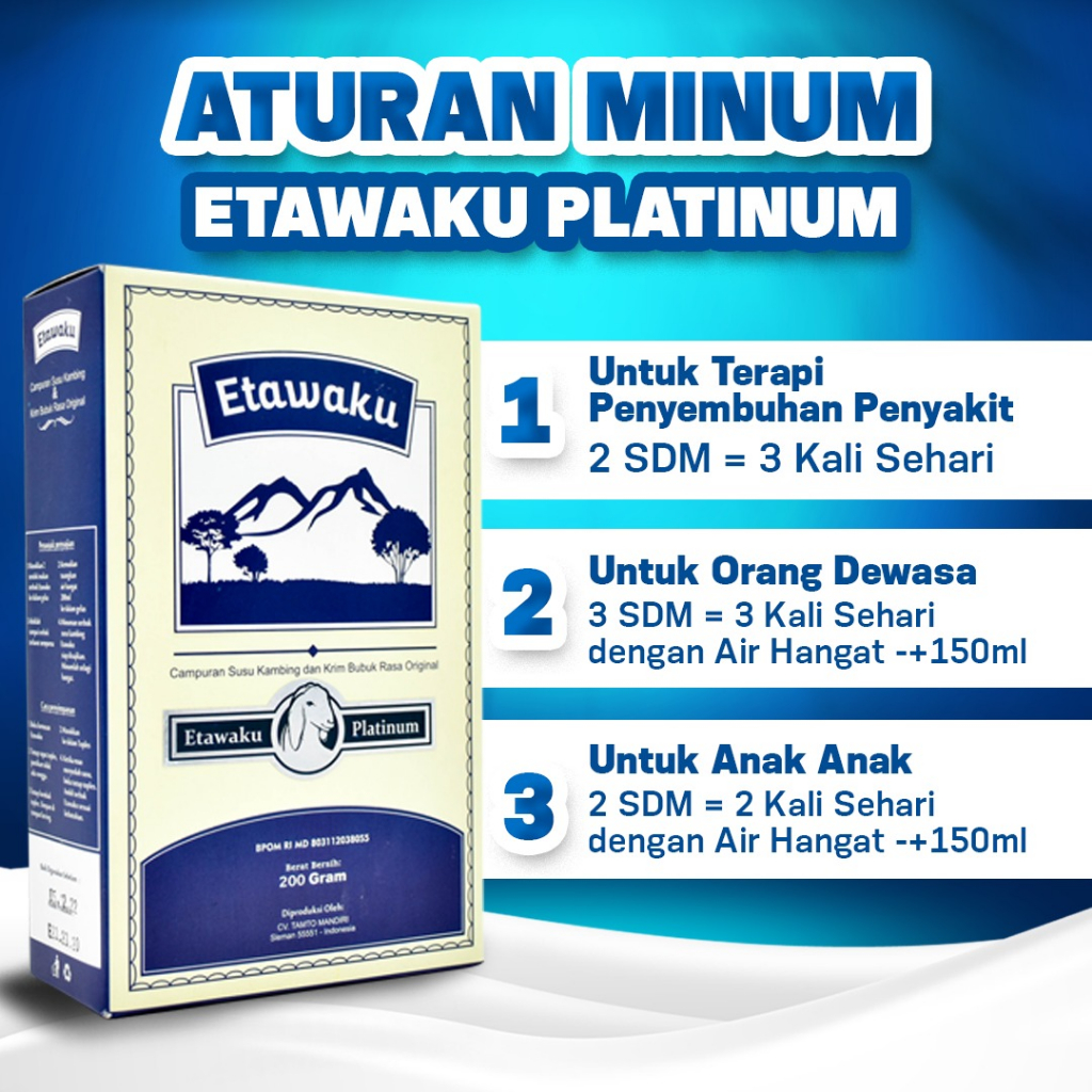 π₯ 4 Kebaikan yang Terdapat pada Etawaku Platinum : * Memiliki Kandungan Protein dan Vitamin Kompleks yang lengkap setara dengan ASI sehingga baik dikonsumsi untuk ibu menyusui dan anak-anak. * Formulasi Premium berkarakteristik unik, ringan dan segar, kaya nutrisi, lembut dan mudah dicerna anak dan Orang dewasa. * Etawaku sebagai tambahan yang baik untuk diet sehat dan seimbang. * Pengganti terbaik susu alami untuk mereka yang alergi / sensitif terhadap susu sapi, atau produk susu kedelai lainnya.