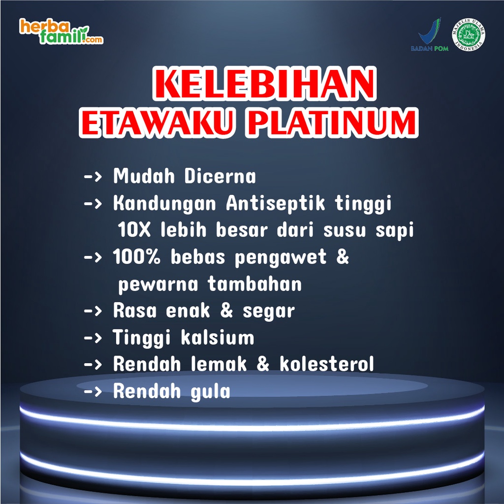 4 Kebaikan yang Terdapat pada Etawaku Platinum : a. Memiliki Kandungan Protein dan Vitamin Kompleks yang lengkap setara dengan ASI sehingga baik dikonsumsi untuk ibu menyusui dan anak-anak. b. Formulasi Premium berkarakteristik unik, ringan dan segar, kaya nutrisi, lembut dan mudah dicerna anak dan Orang dewasa. c. Etawaku sebagai tambahan yang baik untuk diet sehat dan seimbang. d. Pengganti terbaik susu alami untuk mereka yang alergi / sensitif terhadap susu sapi, atau produk susu kedelai lainnya.