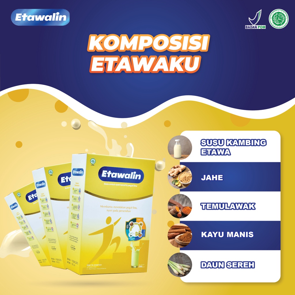 𝐊𝐨𝐦𝐩𝐨𝐬𝐢𝐬𝐢 𝐄𝐭𝐚𝐰𝐚𝐥𝐢𝐧 : ✅ Susu Kambing Etawa Susu Etawa memiliki kandungan kalsium lebih banyak daripada susu lainnya. Dalam satu gelas susu kambing (± 235 ml) terdapat sekitar 330 mg kalsium yang menjaga serta menguatkan tulang. Memiliki senyawa protein CSN1S2 yang dapat menjaga kepadatan tulang dan meminimalisir risiko osteoporosis dan radang sendi. ✅ Jahe Jahe dapat menghalangi pembentukan senyawa peradangan prostaglandin dan leukotrien dan juga memiliki efek antioksidan yang memecah peradangan dan keasaman yang ada pada cairan di dalam persendian. ✅Temulawak Temulawak kaya akan kurkumin yang bermanfaat untuk menekan radang sendi dan mengurangi gejala asam urat. Juga memiliki kandungan ibuprofen dalam temulawak yang bisa membantu meredakan rasa sakit pada tulang dan sendi. ✅ Kayu Manis Kayu manis mengandung senyawa cinnamaldehyde yang memberi rasa dan bau pada kayu manis. Cinnamaldehyde menghentikan pelepasan asam arakidonat, asam lemak peradangan. Hal ini membuat kayu manis efektif dalam mengurangi peradangan yang disebabkan oleh penyakit seperti radang sendi. ✅ Daun Salam & Sereh Melansir dari Health Benefit Times, daun salam mengandung asam laurat dan beberapa komponen aktif. Sementara itu, sereh juga memiliki kandungan antioksidan dan anti-peradangan yang mampu mencegah berbagai penyakit.