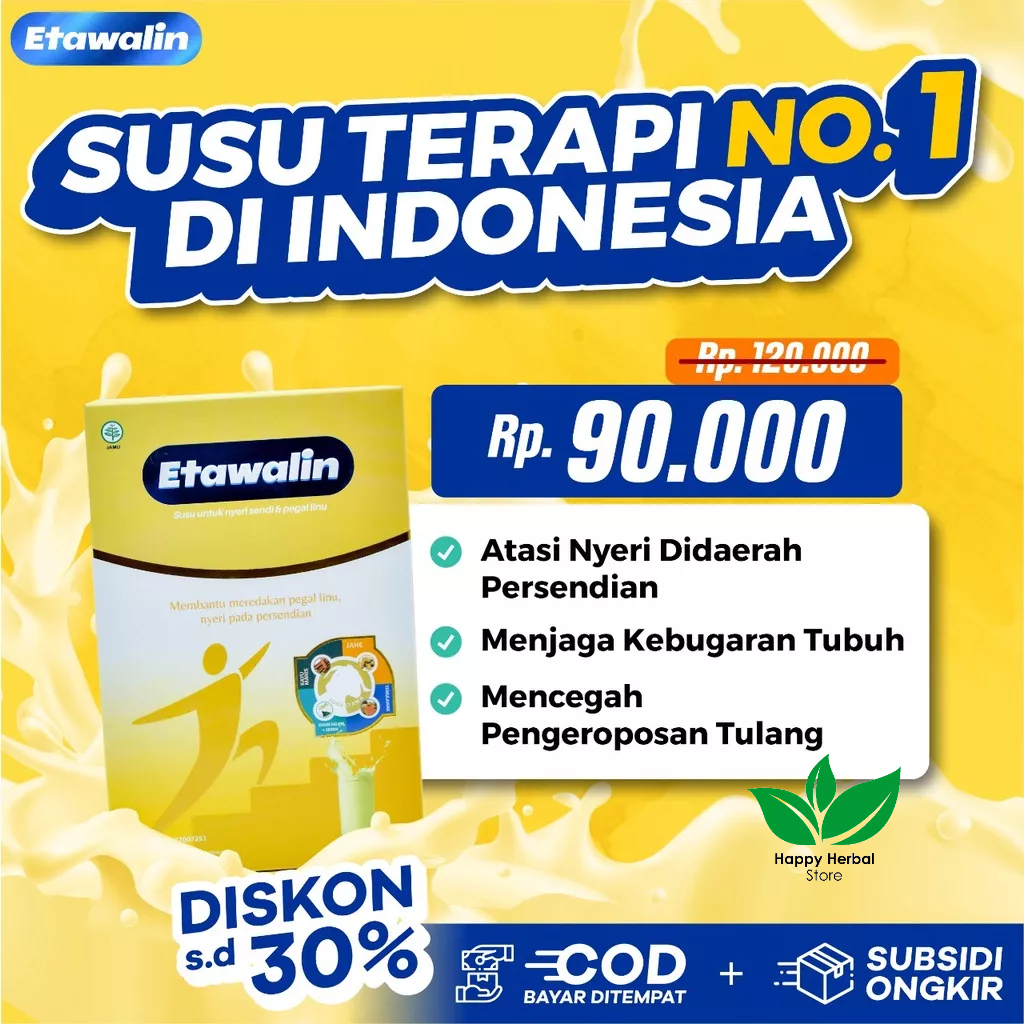 𝙅𝙖𝙣𝙜𝙖𝙣 𝙠𝙝𝙖𝙬𝙖𝙩𝙞𝙧 ! ! ! Kami merekomendasikan 𝙀𝙩𝙖𝙬𝙖𝙡𝙞𝙣 𝙀𝙩𝙖𝙬𝙖𝙡𝙞𝙣 merupakan susu kambing etawa yang diformulasikan dengan 100% bahan herbal alami lainnya yang memiliki cita rasa aman dan nyaman bagi tubuh sebagai terapi kesembuhan tulang dan sendi. Etawalin memiliki kandungan 100% herbal alami dan bahannya dijamin berkualitas. Aman untuk dikonsumsi jangka panjang dan tanpa efek samping atau ketergantungan. Etawalin adalah minuman susu yang diciptakan khusus untuk penderita reumatik, nyeri sendi, hingga asam urat dan sangat berguna untuk meningkatkan kesehatan dan kepadatan tulang.