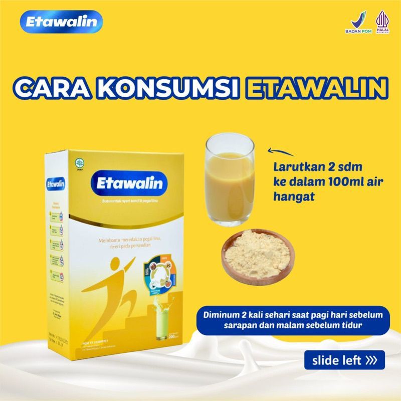 Komposisi Etawalin: ⭐Susu Kambing Etawa Susu Etawa memiliki kandungan kalsium lebih banyak daripada susu lainnya. Dalam satu gelas susu kambing (± 235 ml) terdapat sekitar 330 mg kalsium yang menjaga serta menguatkan tulang. Memiliki senyawa protein CSN1S2 yang dapat menjaga kepadatan tulang dan meminimalisir risiko osteoporosis dan radang sendi. ⭐Jahe Jahe dapat menghalangi pembentukan senyawa peradangan prostaglandin dan leukotrien dan juga memiliki efek antioksidan yang memecah peradangan dan keasaman yang ada pada cairan di dalam persendian. ⭐Temulawak Temulawak kaya akan kurkumin yang bermanfaat untuk menekan radang sendi dan mengurangi gejala asam urat. Juga memiliki kandungan ibuprofen dalam temulawak yang bisa membantu meredakan rasa sakit pada tulang dan sendi. ⭐Kayu Manis Kayu manis mengandung senyawa cinnamaldehyde yang memberi rasa dan bau pada kayu manis. Cinnamaldehyde menghentikan pelepasan asam arakidonat, asam lemak peradangan. Hal ini membuat kayu manis efektif dalam mengurangi peradangan yang disebabkan oleh penyakit seperti radang sendi. ⭐Daun Salam & Sereh Melansir dari Health Benefit Times, daun salam mengandung asam laurat dan beberapa komponen aktif. Sementara itu, sereh juga memiliki kandungan antioksidan dan anti-peradangan yang mampu mencegah berbagai penyakit.