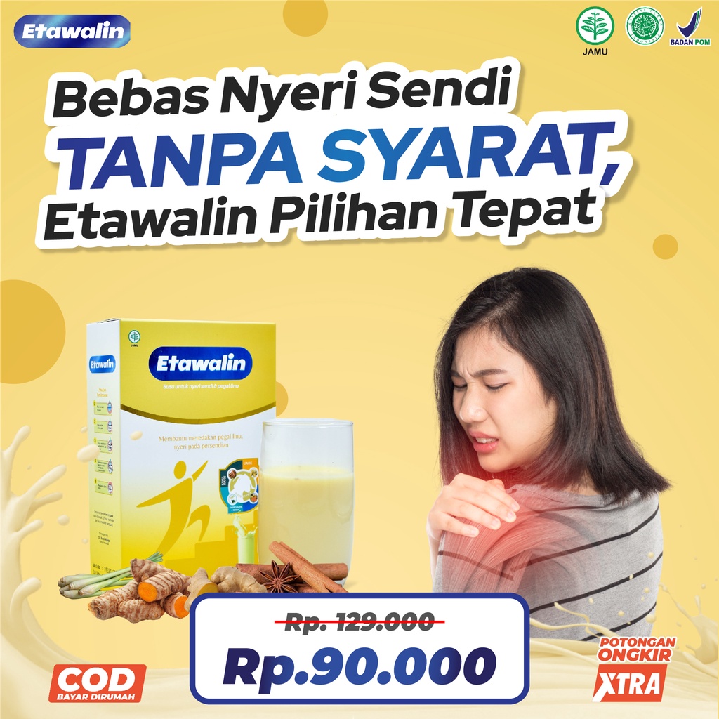 Komposisi Etawalin : + Susu Kambing Etawa Susu Etawa memiliki kandungan kalsium lebih banyak daripada susu lainnya. Dalam satu gelas susu kambing (± 235 ml) terdapat sekitar 330 mg kalsium yang menjaga serta menguatkan tulang. Memiliki senyawa protein CSN1S2 yang dapat menjaga kepadatan tulang dan meminimalisir risiko osteoporosis dan radang sendi. + Jahe Jahe dapat menghalangi pembentukan senyawa peradangan prostaglandin dan leukotrien dan juga memiliki efek antioksidan yang memecah peradangan dan keasaman yang ada pada cairan di dalam persendian. + Temulawak Temulawak kaya akan kurkumin yang bermanfaat untuk menekan radang sendi dan mengurangi gejala asam urat. Juga memiliki kandungan ibuprofen dalam temulawak yang bisa membantu meredakan rasa sakit pada tulang dan sendi. + Kayu Manis Kayu manis mengandung senyawa cinnamaldehyde yang memberi rasa dan bau pada kayu manis. Cinnamaldehyde menghentikan pelepasan asam arakidonat, asam lemak peradangan. Hal ini membuat kayu manis efektif dalam mengurangi peradangan yang disebabkan oleh penyakit seperti radang sendi. + Daun Salam & Sereh Melansir dari Health Benefit Times, daun salam mengandung asam laurat dan beberapa komponen aktif. Sementara itu, sereh juga memiliki kandungan antioksidan dan anti-peradangan yang mampu mencegah berbagai penyakit.