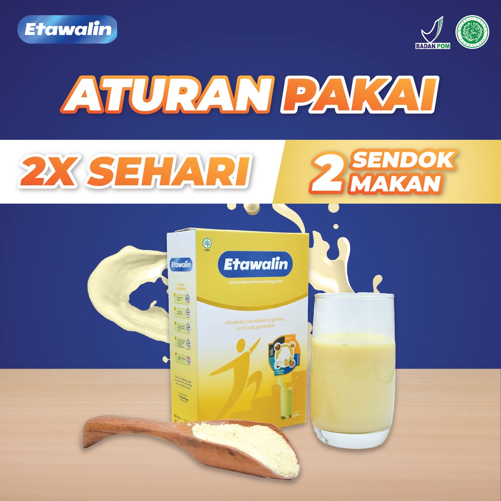 Aturan Pakai Etawalin 2x Sehari sebanyak 2 sendok makan. Lalu diseduh dengan air hangat sebanyak 200ml.