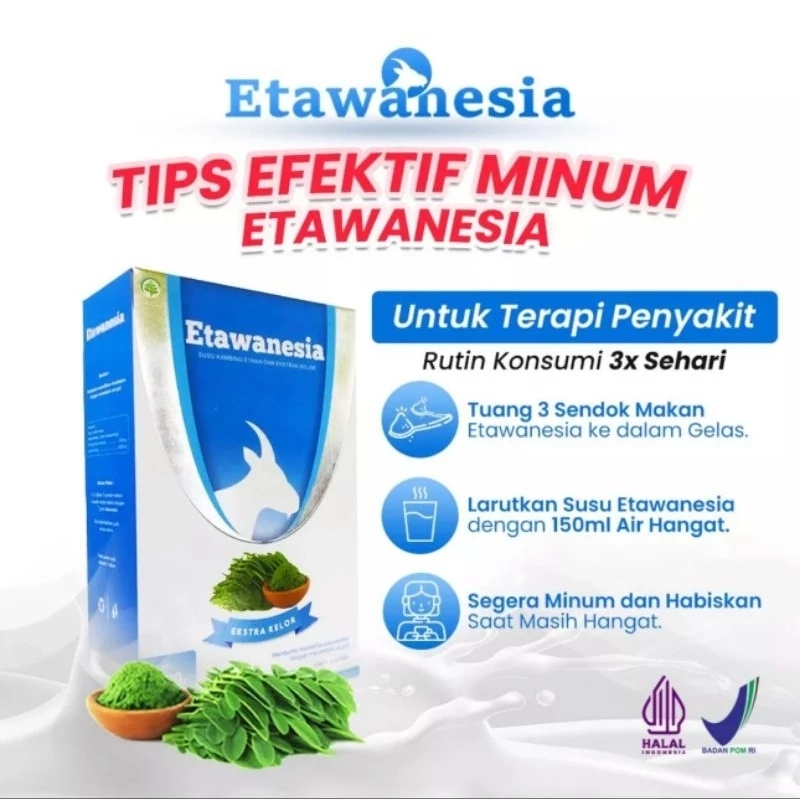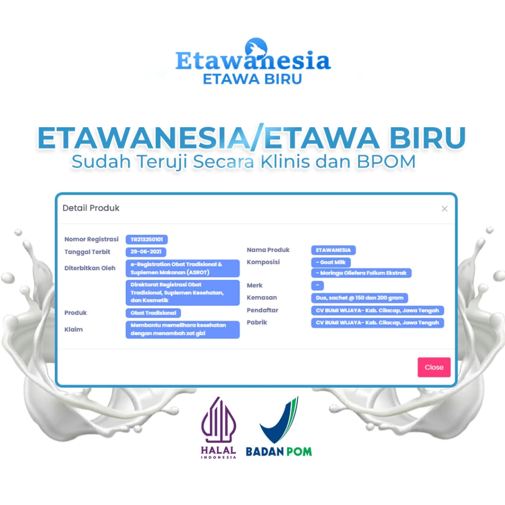 Etawanesia adalah susu kambing etawa premium yang diformulasikan dengan Daun Kelor (Moringa Folium Ekstrak) sehingga memiliki cita rasa yang nikmat, tidak bau prengus dan nyaman untuk dikonsumsi serta aman sekaligus memiliki khasiat yang lebih ampuh untuk mengatasi masalah pernafasan dan tulang.