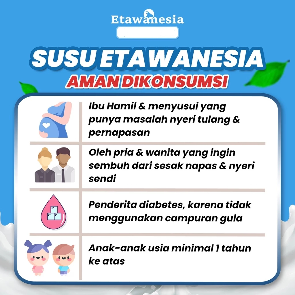MANFAAT ETAWANESIA : ✔ Mengatasi gangguan pernafasan ✔ Menjaga kesehatan dan kepadatan tulang ✔ Mengatasi penyakit kolesterol ✔ Meningkatkan stamina dan daya tahan tubuh ✔ Melancarkan sistem pencernaan ✔ Melancarkan produksi ASI ✔ Membantu meningkatkan kecerdasan anak ✔ Baik untuk penderita diabetes dan obesitas