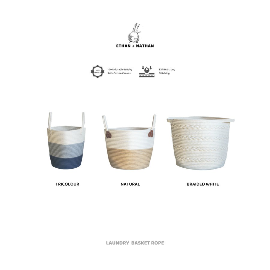 Size : - Natural 27 x 32 x 27 cm - Tricolour 23 x 28 x 30 cm - Braided White 31 x 35 x 31 cm Material : 100% Cotton Rope