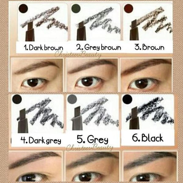 Eye brow ini terdiri dari 6 shades loh: > 01 Dark Brown > 02 Grey Brown > 03 Brown > 04 Dark Grey > 05 Grey > 06 Black > 07 Light Brown
