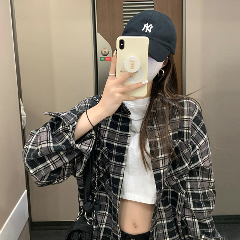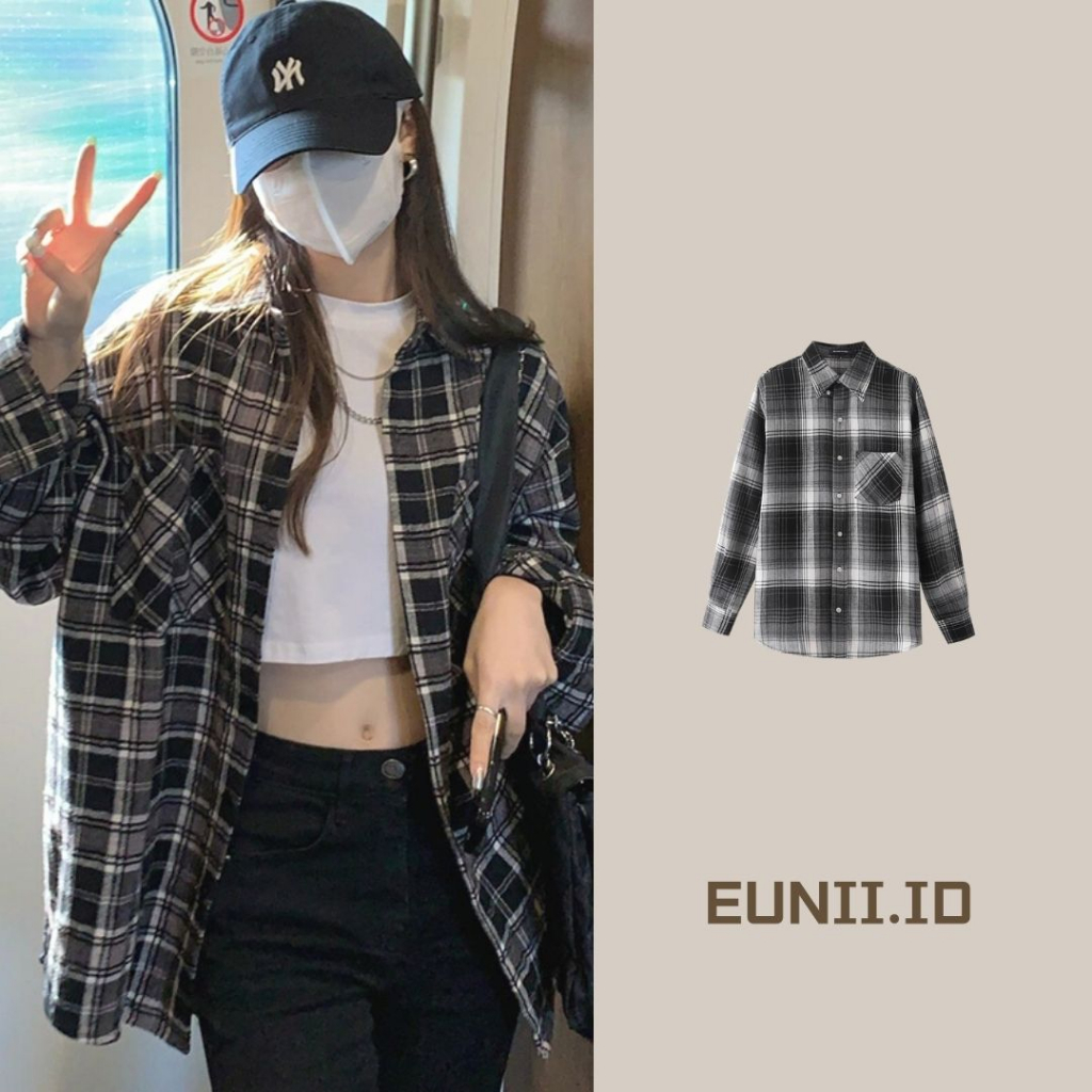 Detail EUNII Blouse Wanita Kemeja Kotak-kotak Lengan Panjang Wanita Blouse Oversize Korean Style
