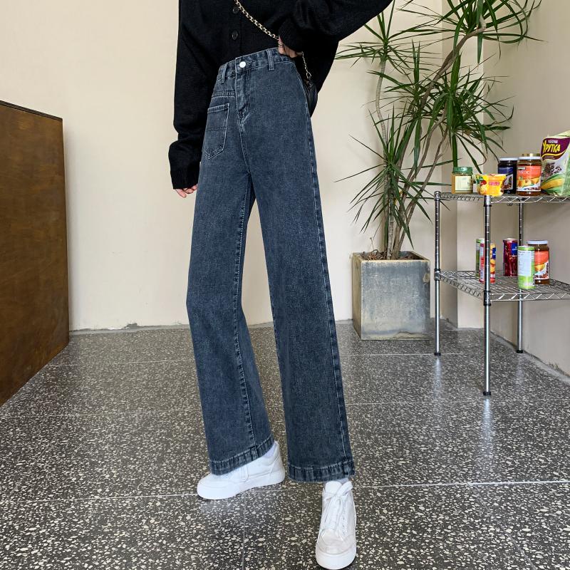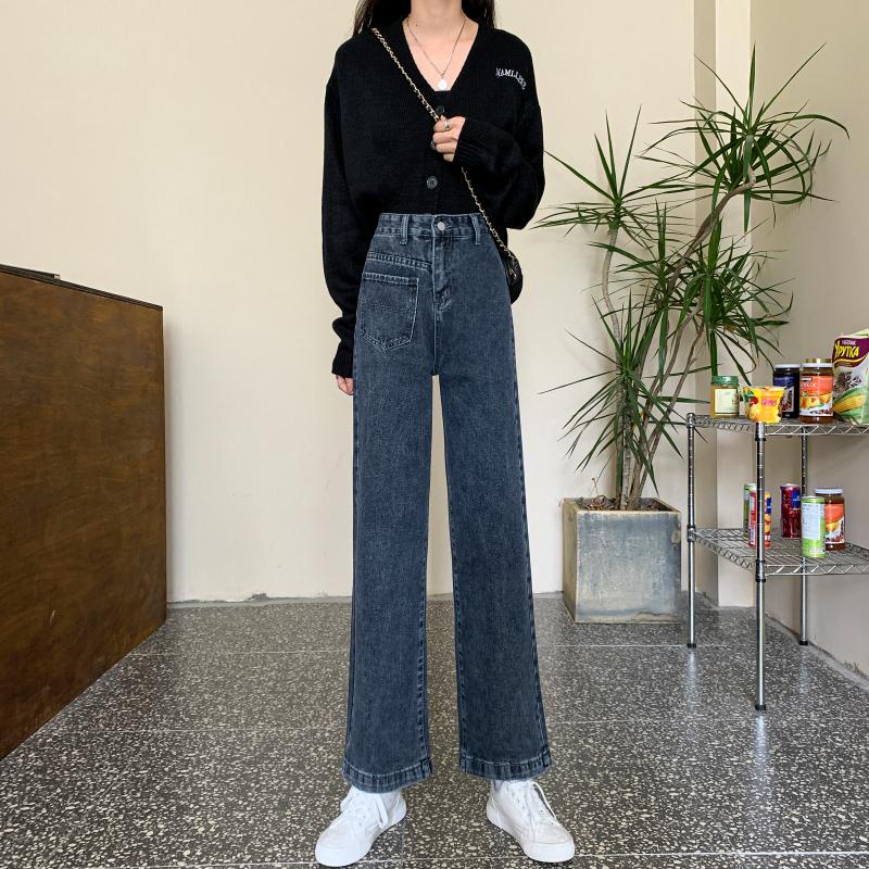 Detail EUNII Celana Jeans Wanita Retro Hitam High Waist Straight Pants Korean Style