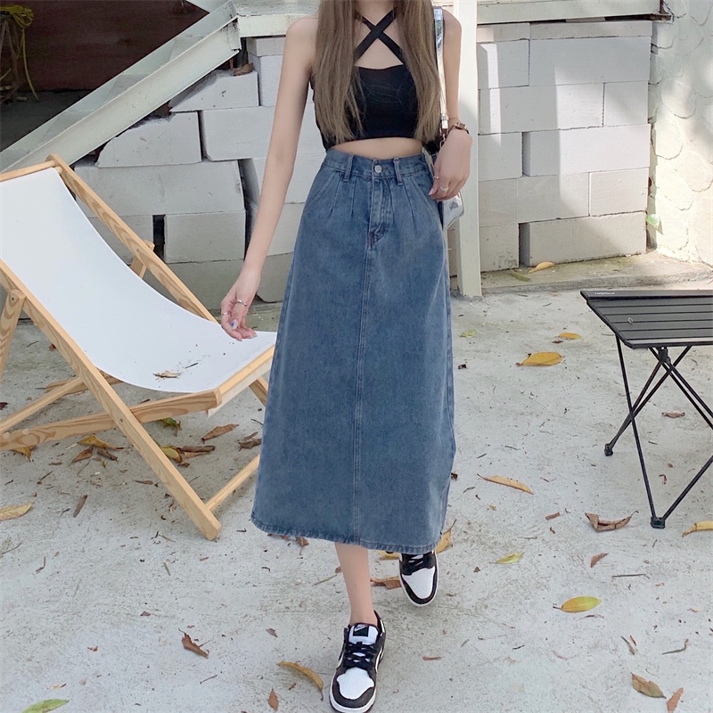 Detail EUNII Korean Style A-line Skirt Midi Slit Rok Denim Panjang Wanita High Waist Skirt