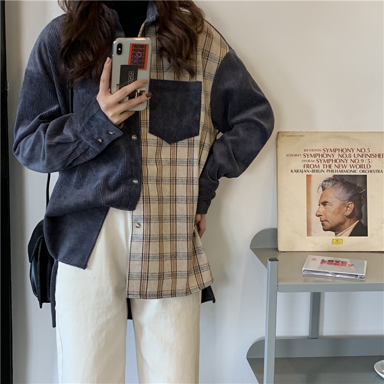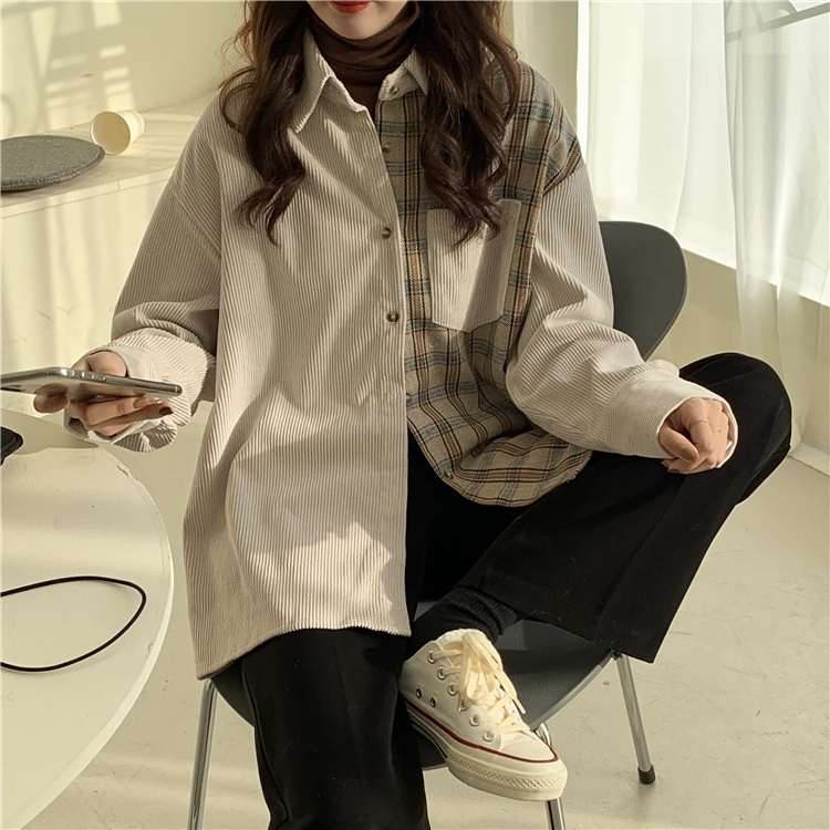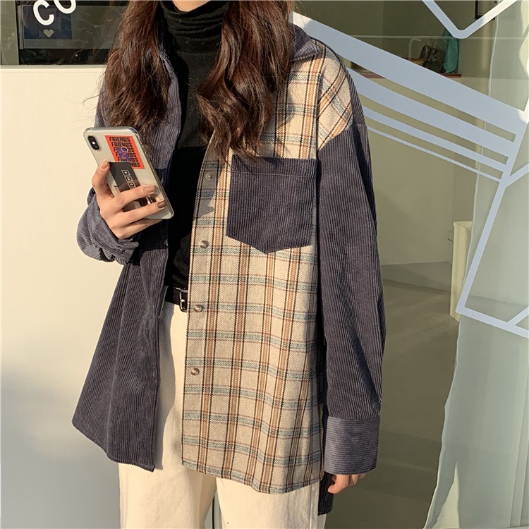 Detail EUNII Korean Style Kemeja Kotak-kotak Longgar Lengan Panjang Retro Korduroi Jahitan Atasan Wanita