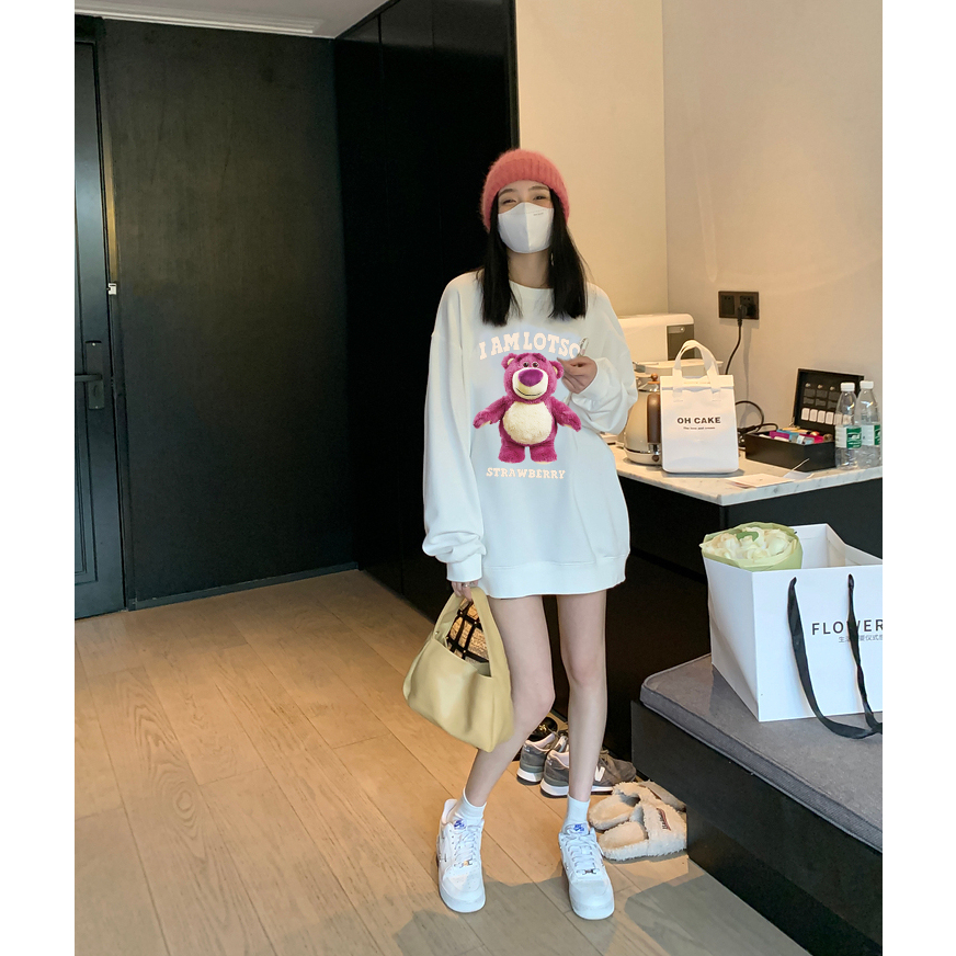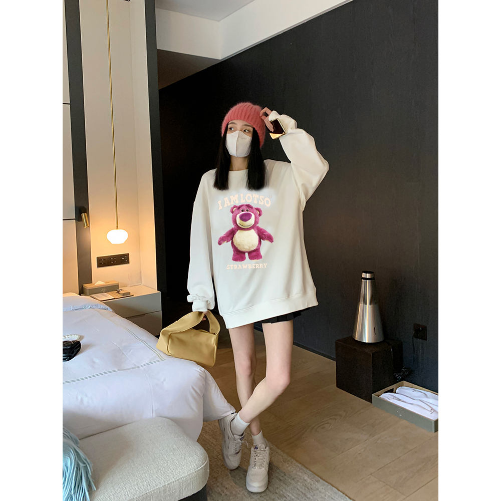 Detail EUNII Sweater Lengan Panjang Cartoon Strawberry Bear Painting Korean Style/Hoodie Oversize/Baju Wanita/Switer Wanita