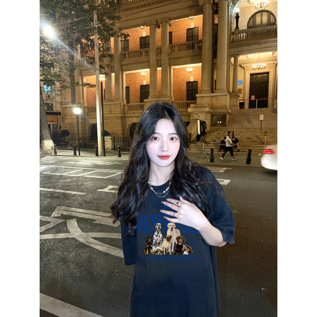 EUNII T-shirt Lengan Pendek Black Washed Cartoon Cow Dog Family Printing Korean Style/Kaos Atasan Wanita/Baju Wanita/Kaos Wanita