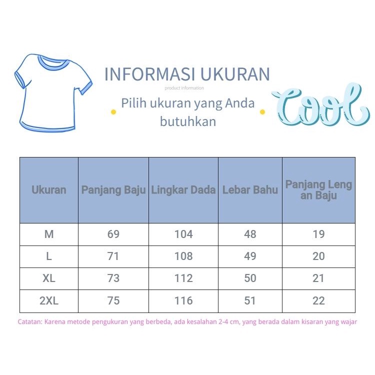 Ukuran: M Panjang Baju:68cm Lingkar Dada:104cm Panjang lengan:19cm Lebar bahu:48cm L Panjang Baju:70cm Lingkar Dada:108cm Panjang lengan:20cm Lebar bahu:49cm XL Panjang Baju:72cm Lingkar Dada:112cm Panjang lengan:21cm Lebar bahu:50cm 2XL Panjang Baju:74cm Lingkar Dada:116cm Panjang lengan:22cm Lebar bahu:51cm