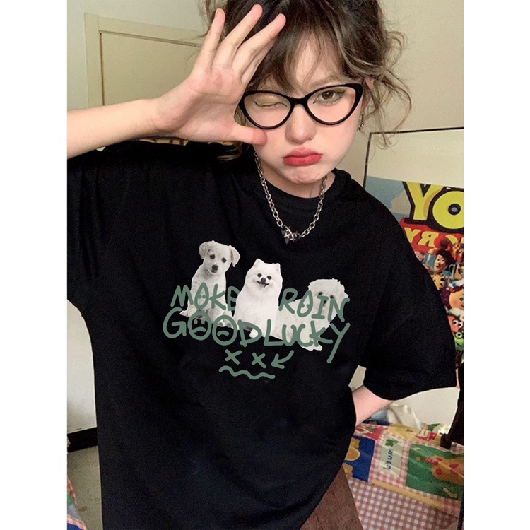 Detail EUNII T-shirt Lengan Pendek Imut Anjing Pencetakan Longgar Korean Style/Kaos Atasan Wanita/Baju Kaus Oversize Wanita