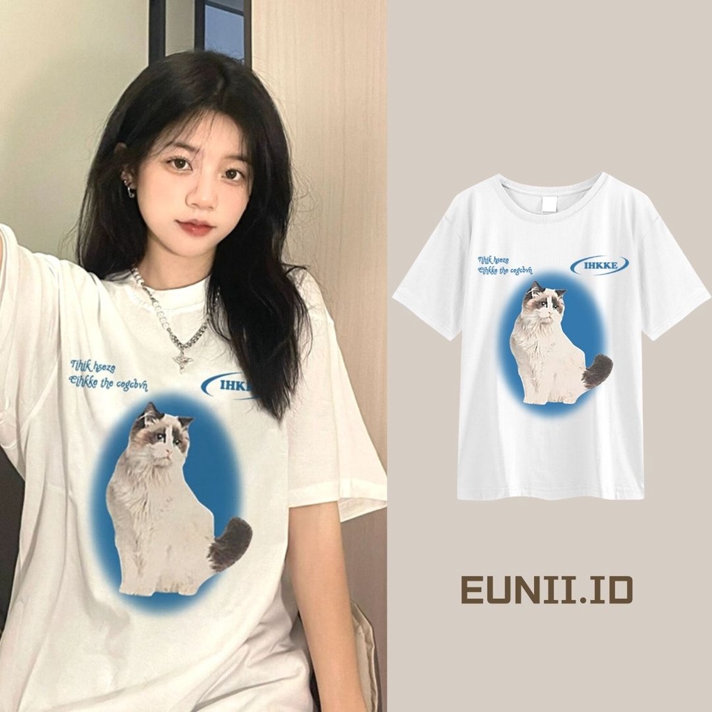 Detail EUNII T-shirt Lengan Pendek Imut Anak Kucing Pencetakan Longgar Korean Style/Kaos Atasan Wanita/Baju Kaus Oversize Wanita