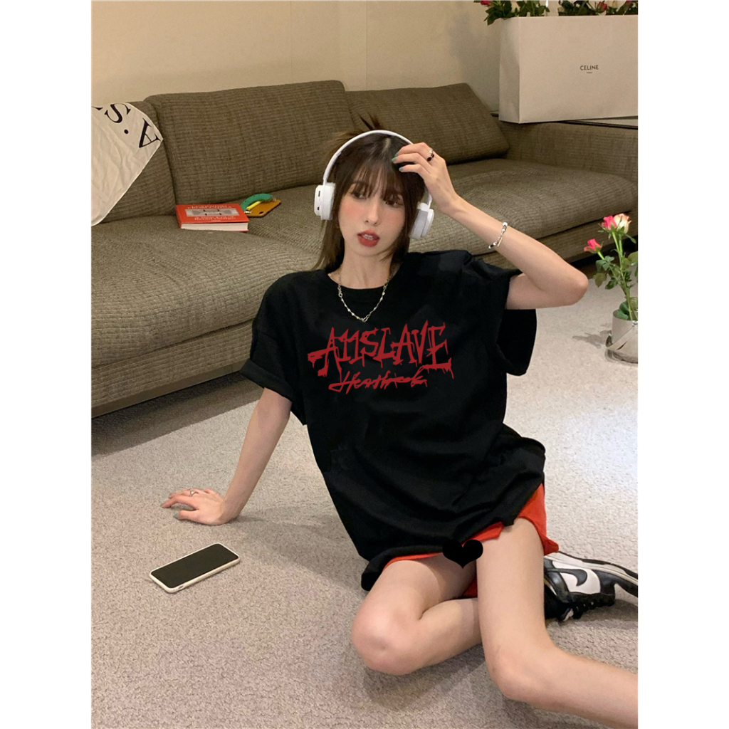 Pakaian Wanita > Atasan > Kaus > EUNII T-shirt Lengan Pendek Retro Red English Design Korean Style/Kaos Atasan Wanita/Baju Kaus Oversize Wanita/Kaos Wanita