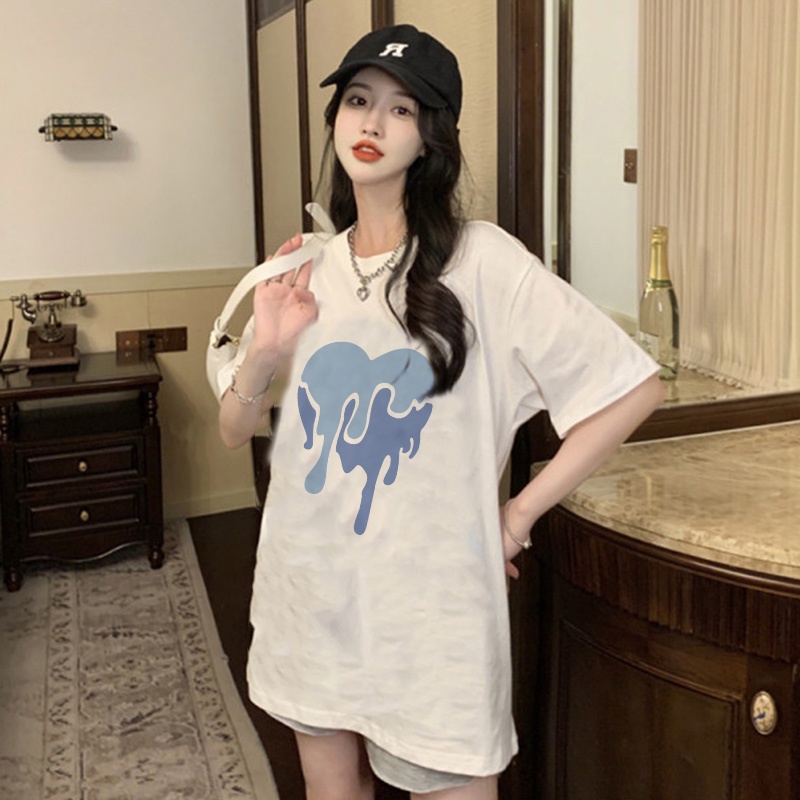 Detail EUNII T-shirt Lengan Pendek Blue Flow Heart Korean Style/Kaos Atasan Wanita/Baju Kaus Oversize Wanita