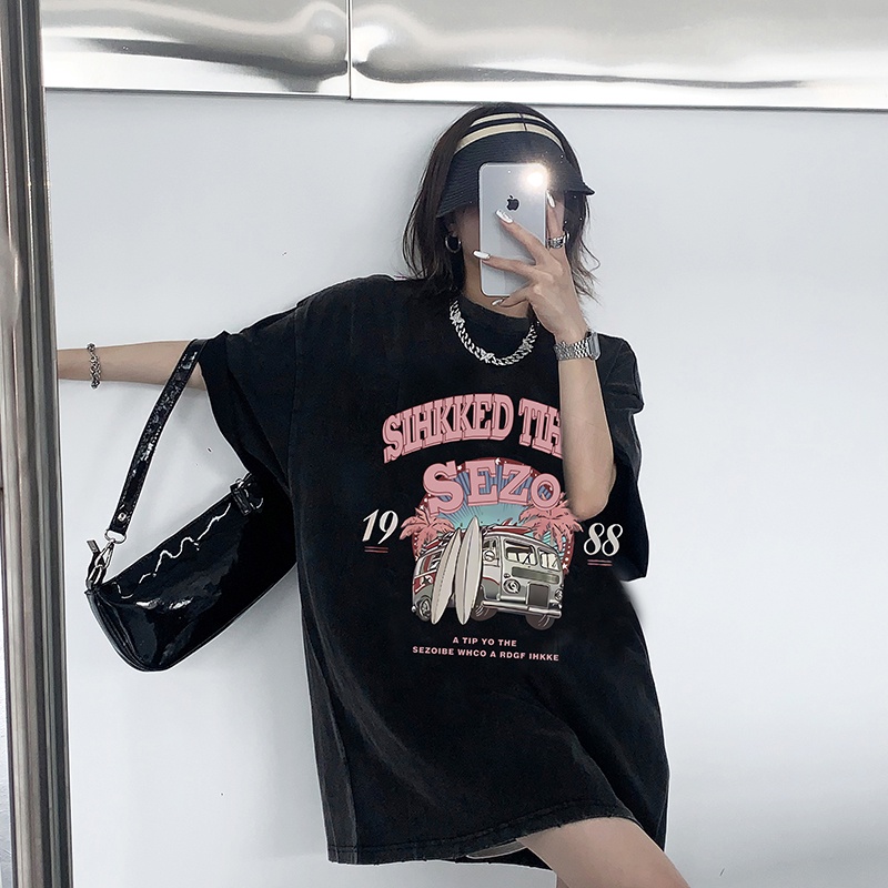 Detail EUNII T-shirt Lengan Pendek Black Washed Retro Car Printing Korean Style/Kaos Atasan Wanita/Baju Wanita/Kaos Wanita
