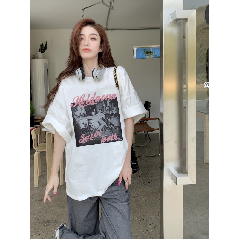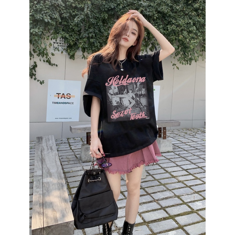 Detail EUNII T-shirt Lengan Pendek Retro Pink Record Korean Style/Kaos Atasan Wanita/Baju Kaus Oversize Wanita/Kaos Wanita